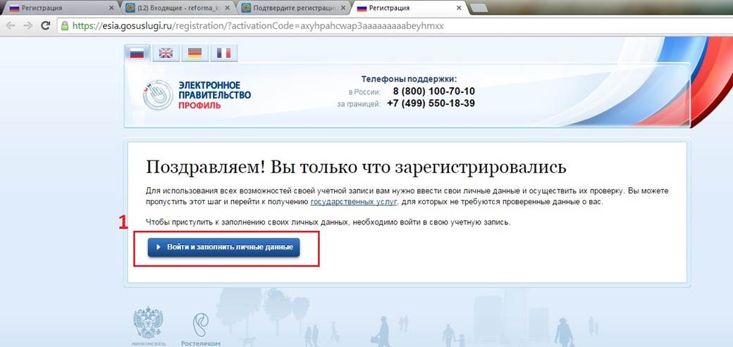 1. После сохранения пароля появится экран, на котором необходимо нажать кнопку «Войти и заполнить личные данные».