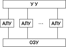 Архитектура с параллельными процессорами. Здесь несколько АЛУ работают под управлением одного УУ. Это означает, что множество данных может обрабатываться по одной программе — то есть по одному потоку команд. Высокое быстродействие такой архитектуры можно получить только на задачах, в которых одинаковые вычислительные операции выполняются одновременно на различных однотипных наборах данных. Структура таких компьютеров представлена на рис. 2.4.