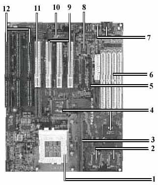 | 1 — Разъём под центральный процессор; 2 — Дополнительный кэш объёмом 256 Кбайт; 3 — Разъём под дополнительный кэш; 4 — Контроллеры внешних устройств; 5 — Разъёмы накопителей на жёстких магнитных дисках; 6 — Разъёмы под оперативную память, 4 планки; 7 — Коннектор (соединитель) клавиатуры и мыши; 8 — Микросхема, обслуживающая флоппи-дисковод, последовательные порты и параллельный порт; 9 — Разъёмы 32-битной шины (для видеокарты, карты Интернет и др.); 10 — Перезаписываемая BIOS (Flash-память); 11 — Мультимедийная шина; 12 — Разъёмы 16-битной шины. |