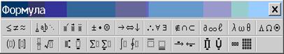 Для записи формулы необходимо установить курсор в нужное место и обратиться к меню Вставка/Объект/Microsoft Equation 3.0. При этом должны появиться рамка для ввода формулы и панель редактора формул, содержащая два ряда кнопок. Верхний ряд кнопок определяет палитру символов, нижний — палитру шаблонов. Завершение ввода формулы можно выполнить щелчком мыши вне поля ввода.