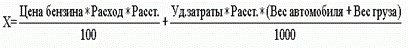 Будем считать, что себестоимость перевозок складывается из затрат на топливо и других затрат, пропорциональных весу автомобиля с грузом и пройденному расстоянию. Тогда затраты X можно вычислить по формуле:
