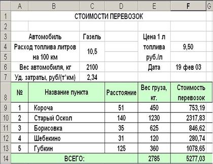 Рассмотрим организацию простейших вычислений на примере таблицы стоимости автоперевозок.