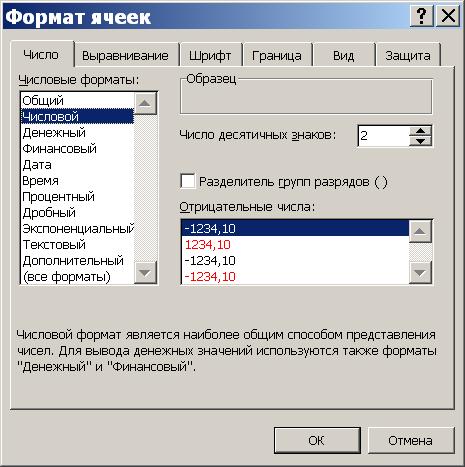 Основными операциями форматирования чисел являются: задание количества знаков в десятичной части; выравнивание по правому краю и отступ справа. Числа выравниваются по правому краю по умолчанию, однако в некоторых случаях для этой цели можно использовать соответствующую кнопку на стандартной панели инструментов. Количество знаков в десятичной части числа задается на вкладке "Число" окна "Формат ячейки". При выборе числового формата "Числовой" окно принимает вид, показанный на рисунке.