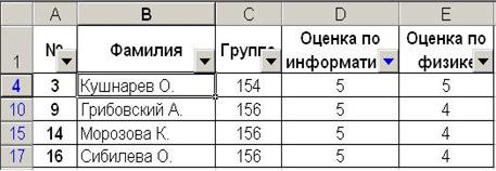 Для применения автофильтра необходимо выделить любую клетку внутри фильтруемой таблицы и обратиться к меню Данные/Фильтр.../Автофильтр. После обращения в заголовке таблицы должны появиться кнопки для раскрытия списков. Нажатие любой кнопки приводит к раскрытию списка элементов соответствующего столбца таблицы. Выбранный элемент является критерием фильтрации. Строки таблицы, в которых элементы столбца не совпадают с критерием будут скрыты, причем за совпавшими сохраняются их прежние порядковые номера. Выбор второго критерия в другом списке приведет к дополнительной фильтрации записей и т.д. В качестве примера рассмотрим применение автофильтра для таблицы с итогами сессии. На рисунке показаны результаты фильтрации по условию "Оценка по информатике"=5.