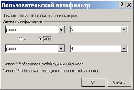 Для задания более сложного условия фильтрации необходимо в соответствующем раскрывающемся списке выбрать "[Условие...]" и сформулировать его в открывшемся окне "Пользовательский автофильтр". Окно содержит поля для ввода знаков логических отношений и метки логических операций И и ИЛИ. Например, для отбора записей, соответствующих студентам, получившим по информатике 4 или 5, следует выполнить настройки, как показано на рисунке.