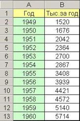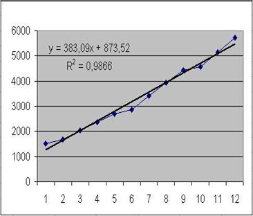 Вычислить по формуле y = 383,09x + 873,52. Следует учесть, что аргументом трендовой модели является порядковый номер, т.е. в нашем примере x=13. В результате получим прогноз на 1961 год: 5853,69 тысяч пассажиров.