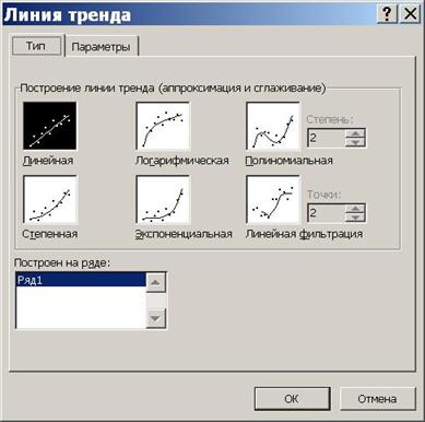 Многие экспериментальные данные можно интерпретировать как временные ряды - последовательность измерений, полученных в определенные моменты времени ti, где i - порядковый номер измерения на оси времени. Такие ряды характеризуются некоторой тенденцией развития процесса во времени и называются трендовыми. Используя трендовые модели, можно выдавать прогнозы на краткосрочный и среднесрочный периоды. Excel имеет средства для создания трендовых моделей встроенные в построитель диаграмм.