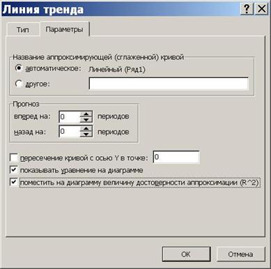 В окне "Линия тренда" открыть вкладку "Параметры" и установить флажки "Показывать уравнение на диаграмме" и "Поместить на диаграмму величину достоверности аппроксимации".