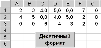 На рисунке показан диапазон C1:E2, преобразованный в требуемый формат макросом, запускаемым кнопкой с надписью "Десятичный формат".