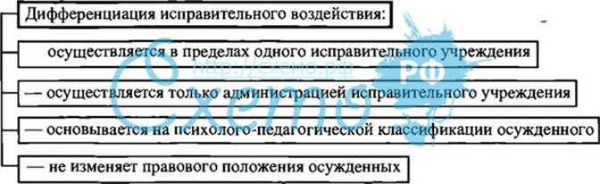 Дифференциация исполнения наказания и процесса исправительного воздействия предполагает, что к различным категориям осужденных, в зависимости от характера совершённых ими преступлений, степени общественной опасности, прошлой преступной деятельности - следует применять различный объём карательного воздействия и правоограничений. А воспитательная работа с ними должна строится, с учётом специфических характеристик их личности, возраста, пола и иных психолого-педагогических особенностей.