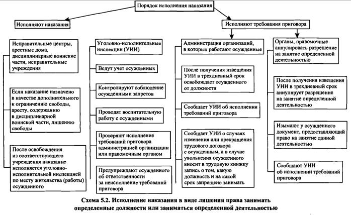 Лишения права занимать определённые должности или заниматься определённой деятельностью (ст. 47 УК РФ, ст. 33-38 УИК РФ). ст. 33, "Уголовно-исполнительный кодекс Российской Федерации" от 08.01.1997 N 1-ФЗ (ред. от 30.12.2012).
