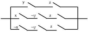 Нехай x 1, x 2,..., xn – набір контактів у схемі. Контакти можуть бути розмикальними й замикаючими. Контакт називається им якщо він замикається при подачі напруги. Контакт називається розмикальним, якщо він розмикається при подачі напруги. Той самий контакт у схемі може бути як замикаючим, так і розмикальної.