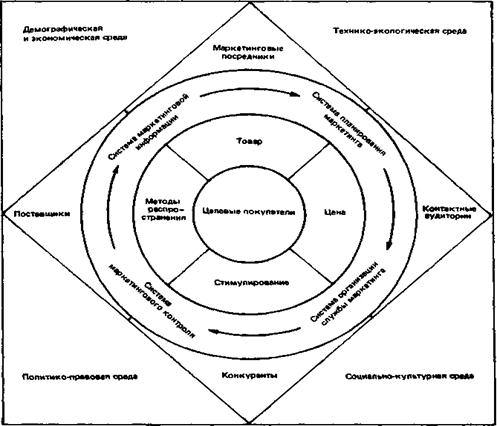 Спомощью этих систем фирма следит за маркетинговой средой и приспосабливается к ней. Приспосабливается фирма и к своей собственной микросреде, состоящей из маркетинговых посредников, поставщиков, конкурентов и контактных аудиторий. И наконец, она приспосабливается к макросреде ¾ демографическим и экономическим, политико-правовым, технико-экологическим и социально-культурным факторам. При разработке и позиционировании своего предложения на целевом рынке фирма принимает в расчет все обстоятельства и силы, действующие в маркетинговой среде.
