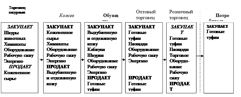 По размерам товарной номенклатуры и денежного оборота рынок товаров промышленного назначения превосходит соответствующие показатели рынка товаров широкого потребления. Чтобы изготовить и продать обыкновенную пару туфель, нужно, чтобы торговец шкурами продал эти шкуры кожевникам, которые продали бы выдубленную и отделанную кожу обувщикам, которые продали бы готовые туфли оптовым торговцам, а те в свою очередь розничным торговцам, которые, наконец, продали бы их широкому потребителю. Помимо этого, каждому участнику производственно-распределительной цепочки приходится закупать и множество других товаров и услуг. На рис. 39 наглядно показано, какое значительное количество сделок включает в себя процесс изготовления и продажи пары туфель.