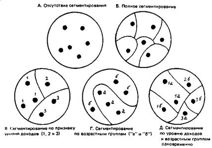 Многие производители не видят смысла в приспособлении своих товаров для удовлетворения нужд каждого конкретного покупателя. Вместо этого продавец выявляет широкие разряды покупателей, отличающихся друг от друга своими требованиями к товару и/или своими ответными маркетинговыми реакциями. Например, продавец может обнаружить, что потребности меняются в зависимости от уровня доходов покупателей. На рис. 43в принадлежность каждого покупателя к той или иной группе по уровню доходов обозначена соответствующим номером (1, 2 и 3). Покупатели, относящиеся к одному и тому же классу по уровню доходов, отделены от остальных линией. При сегментировании по уровню походов получается три сегмента, причем сегмент покупателей класса 1 оказывается самым многочисленным.