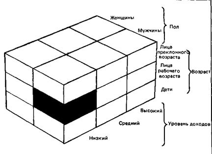 Сегментирование по нескольким демографическим параметрам. Большинство фирм проводят сегментирование рынка на основе сочетания двух или более демографических переменных. Например, пансионат берет на себя заботу о слепых людях, заботится о поддержании их психологического состояния, обеспечивает профессиональное обучение. Однако в связи с ограниченными возможно стями пансионат не в состоянии оказать помощь всем слепым людям разного общественного положения. На рис. 44 показан пример многофакторного сегментирования этих лиц по признакам возраста, пола и уровня доходов. Пансионат остановил свой выбор на обслуживании слепых мужчин рабочего возраста с низким уровнем доходов, поскольку его руководство считает, что в состоянии наилучшим образом удовлетворить нужды именно этой группы потенциальных клиентов.