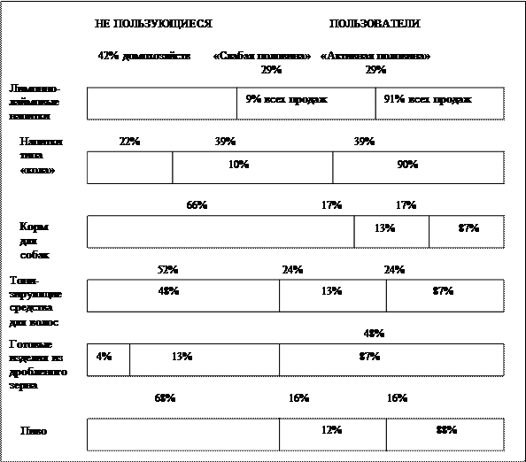 Интенсивность потребления. Рынки можно также разбивать по группам слабых, умеренных и активных потребителей товара. Активные пользователи часто составляют небольшую часть рынка, однако на их долю приходится большой процент общего объема потребления товара. Ряд данных об интенсивности потребления популярных товаров ширпотреба приводится на рис. 45. На примере потребления пива видно, что 68% опрошенных его не пьют. Оставшиеся 32% разбились на две группы по 16% в каждой. Одну составили слабые потребители, на долю которых приходится 12% общего объема потребления пива, другую ¾ активные, потребляющие 88% пива, т.е. в семь раз больше слабых. Естественно, что пивовар предпочтет скорее привлечь для своей марки одного активного потребителя, чем нескольких слабых. Большинство пивоваренных фирм ориентируют свои усилия именно на активных потребителей с помощью доводов типа того, которым пользуется фирма «Шефер»: «Одно пиво, которое нужно выпить, когда предлагают больше одного».