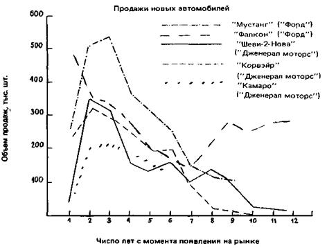 Понятие жизненного цикла можно применить для описания целого товарного класса (автомобили с бензиновыми двигателями), разновидности товара (автомобили с откидным верхом) или конкретной марки («Мустанг»). В каждом из этих случаев понятие жизненного цикла имеет разный характер. Самый длительный цикл жизни у товарных классов. Сбыт многих товарных классов надолго задерживается в рамках этапа зрелости. И наоборот. Разновидности обычно имеют типичную кривую жизненного цикла. Такие товары, как телефоны с наборным диском и кремы-дезодоранты, проходят обычный цикл выведения на рынок, быстрого роста, зрелости и упадка. История индивидуальной марки зависит от ее успеха и от эффективности атак и контратак конкурентов. Жизненные циклы ряда хорошо известных марок автомобилей представлены на рис. 57.