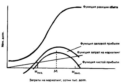 Для определения оптимального уровня маркетинговых затрат управляющий по маркетингу удаляет из функции реакции сбыта все немаркетинговые издержки и получает в результате функцию валовой прибыли. Затем функцию маркетинговых затрат представляют в виде прямой, которая начинается на нулевой отметке и идет наклонно вверх в соотношении 1 долл. маркетинговых затрат по горизонтали на каждые 10 долл. по вертикали. После этого получают функцию прибыли-нетто, вычитая функцию маркетинговых затрат из функции валовой прибыли. Функция прибыли-нетто говорит о положительной чистой прибыли при уровне маркетинговых затрат между Мнизк. и Мвыс. Это и есть рациональный диапазон затрат на маркетинг. Функция чистой прибыли достигает своего максимума в точке М. Следовательно, уровень маркетинговых затрат, обеспечивающих получение максимальной чистой прибыли, должен равняться М долл.