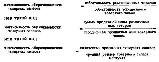 Еще одним полезным с точки зрения аналитической работы коэффициентом служит показатель интенсивности оборачиваемости товарных запасов. Интенсивность оборачиваемости товарных запасов ¾ это число раз полного возобновления или полной распродажи товаров в течение определенного отрезка времени (обычно в течение года). Этот показатель можно рассчитывать на основе суммы себестоимости товаров, суммы продажной цены товаров или количества проданных товарных единиц.