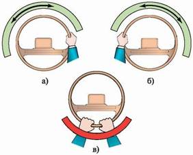 • Не выворачивайте "наизнанку" свои руки, пытаясь продолжить вращение руля в запретной зоне (рис. 11 в).