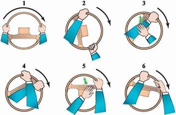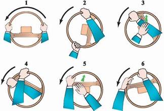Затем некоторое время руки работают одновременно, но потом левая рука опять начинает упираться своим локтем в ваше туловище. Поэтому она должна переместиться и занять место над правой рукой, которая в это время продолжает свою работу. Далее правая рука передает лидерство левой руке и уходит в верхнюю точку на руле. И процесс повторяется.
