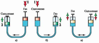 Кому-то помогает физика, на примере двух сообщающихся цилиндров с поршнями (рис. 35).