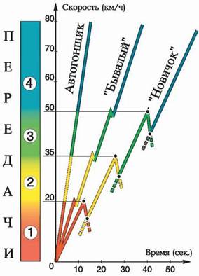 Только учтите, этот график ни в коем случае не претендует на руководство к действию по цифрам. Здесь показана лишь необходимость переключения передач по мере изменения скорости. Все цифры (в графике и далее в тексте) даны только для того, чтобы вы поняли, что невозможно использовать в этой жизни только 1-ю или только 3-ю передачу. Конкретные цифры для вашего автомобиля при вашей водительской квалификации определяются, исходя из реальных условий. Однако любой автомобиль имеет интервалы скоростей для каждой передачи, и наоборот, для каждой передачи есть определенный интервал скоростей. Поэтому, если вы выходите в другой интервал скоростей, необходимо переключиться на другую передачу.