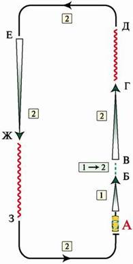 Рис. 44. Разгон, торможение и поворот на второй передаче: А – старт и остановка; А–Б – разгон; 1→2 (Б–В) – переключение с первой передачи на вторую; В–Г и Е–Ж – разгон; Г–Д и Ж–З – торможение; Д–Е и З–А – два поворота