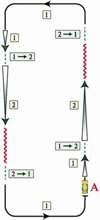 Рис. 45. Разгон, торможение и поворот на первой передаче: 2→1 – переключение со второй передачи на первую