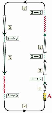 Рис. 46. Разгон до третьей передачи, торможение и поворот на второй передаче: 2→3 – переключение со второй передачи на третью; 3→2 – переключение с третьей передачи на вторую