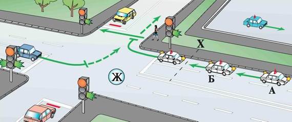 7. Определяемся с "точкой принятия решения" ("X"). Если вы находились в точке "А" и в этот момент зеленый сигнал светофора начал мигать, то у вас есть возможность начать плавное торможение и спокойно остановиться перед стоп-линией.