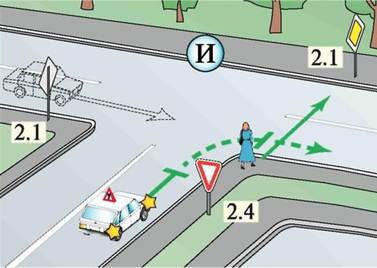 Теперь о повороте в точке "И" (см. рис. 62). От предыдущих он отличается тем, что решение, ехать или сначала полностью остановиться, вы должны принять самостоятельно. Имеется в виду, что знак 2.4 "Уступите дорогу", в отличие от знака 2.5 "Движение без остановки запрещено", не требует от вас обязательной остановки. Если вы не создаете помех движению других машин (на главной дороге), то можете ехать (рис. 67).