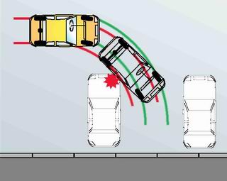 Прежде всего вам надо вспомнить о том, что передние колеса движутся по своей траектории, а задние по своей (см. рис 42 и 54). Причем если траекторию передних колес вы можете легко прогнозировать и контролировать, то о задних колесах водители иногда просто забывают. А ведь они движутся по траектории более близкой к центру поворота, чем передние! Значит, задняя дверь, крыло и багажник вашего автомобиля могут сместиться к "телу" другой машины ближе, чем вы на то рассчитывали (рис. 143). Поэтому заезжать на стоянку придется по траектории более "ломаной" (см. рис. 53) или с предварительным загибом (см. рис. 55), что на обычной дороге не всегда возможно.