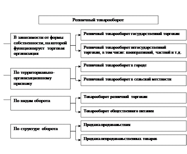 Розничный товарооборот подразделяется на товарооборот розничной торговли и общественного питания, учитывается в розничных ценах (в торговле), фактических продажных (общественное питание), включающих торговую надбавку (торговля), торговую надбавку и наценку (общественное питание), акциз, налог на добавленную стоимость и налог с продаж (торговля), налог на услуги (общественное питание).