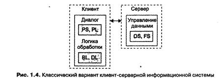 Большинство конфигураций клиент-сервер использует двухуровневую модель, в которой клиент обращается к услугам сервера. Предполагается, что диалоговые компоненты PS и PL размещаются на клиенте, что позволяет обеспечить графический интерфейс. Компоненты управления данными DS и FS размещаются на сервере, а диалог (PS,PL), логика BL и DL — на клиенте. Двухуровневое определение архитектуры клиент-сервер использует именно этот вариант: приложение работает у клиента, СУБД — на сервере (рис. 1.4.).