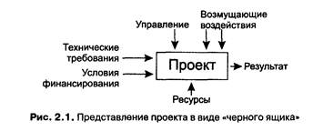 В системном плане проект может быть представлен «черным ящиком», входом которого являются технические требования и условия финансирования, а итогом работы — достижение требуемого результата (рис. 2.1). Выполнение работ обеспечивается наличием необходимых ресурсов:
