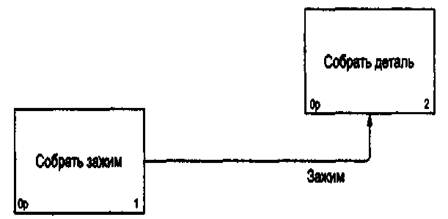 Стрелки выход — механизм исполнения встречаются реже и отражают ситуацию, когда выход одного функционального блока применяется в качестве инструментария для работы другого блоха. На рис.6 зажим, используемый для закрепления детали, должен быть собран для того, чтобы выполнить сборку детали.