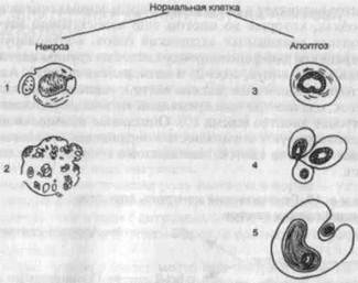 Велико значение апоптоза и в патологии. Процессы атрофии тканей и органов обязаны апоптозу клеток. Апоптоз клеток воспалительного инфильтрата наблюдается в очагах иммунного (лимфоциты) и гнойного (полиморфно-ядерные лейкоциты) воспаления. Он развивается в корковых клетках тимуса при воздействии кортикостероидных гормонов и формировании иммунологической толерантности. Большое значение апоптоз имеет при опухолевом росте и может быть искусственно усилен химиотера-певтическими и лучевыми воздействиями на опухоль. ■ Отличия апоптоза от некроза связаны с различиями в их распространенности, генетическими, биохимическими, морфологическими и клиническими проявлениями.