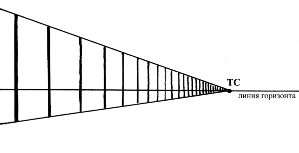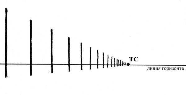Здесь линия горизонта определяется по линии моря. Не будь моря, мы определяли бы линию горизонта по воображаемой линии, находящейся на уровне глаз наблюдателя (изображена пунктиром). Положение линии горизонта всегда связано с уровнем обзора наблюдателя. Определившись с линией горизонта на бумаге, вы должны помнить, что все объекты над ней расположены выше уровня глаз наблюдателя, а все объекты или предметы под ней, соответственно, ниже. На рис. 3.2 изображён ряд вертикальных столбов, все в одну линию и одинаковой высоты. Размеры столбов становятся всё меньше и меньше, пока в какой-то точке совершенно не сходят на нет. Эту точку так и называют точкой схода (ТС). Если столбы находятся на ровной поверхности, ТС попадает точно на линию горизонта.