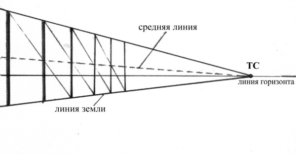 На рис. 3.4 наглядно показано, как можно рассчитать, через какие всё уменьшающиеся промежутки следует рисовать столбы, полагая, конечно, что все они находятся на равном расстоянии друг от друга. Высота каждого столба делится пополам, и через все срединные точки проводится прямая линия. Из верхней точки первого столба проводится линия через середину второго столба. Пересечение этой линии с нижней линией схода даст нижнюю точку уже третьего столба, а значит, и интервал между ними.