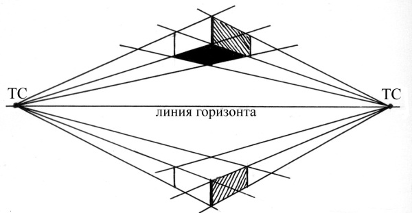 До сих пор мы имели дело лишь с одной точкой схода. На рис. 3.5 изображено прямоугольное строение. Каждая из его сторон подчиняется тем же законам перспективы, но верхние и нижние линии стремятся к разным точкам схода. Данный способ позволяет правильно рисовать любой прямоугольный объект. При этом, если ваше строение изображено правильно, то обе точки схода будут находиться точно на линии горизонта и все верхние линии будут под углом вниз, а все нижние под углом вверх.