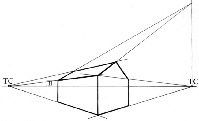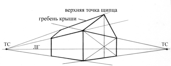 На рис. 9.1 жирными линиями обведены две видимые стены дома. Проведите перпендикуляр через точку пересечения диагоналей торцевой стены. Где-то на этом перпендикуляре будет находиться ближний к нам конец гребня крыши. При этом обратите внимание, что перпендикуляр проходит не через центр стены, а несколько сдвинут к правому углу, что естественно, так как ближняя часть стены кажется нам большей, чем дальняя. Затем отметьте на перпендикуляре нужную высоту верхней точки крыши (щипца) и проведите от неё косые линии, обозначающие скат крыши. Затем соедините верхнюю точку щипца с левой точкой схода, что даёт вам линию гребня крыши. Отдалённый скат крыши приблизительно параллелен ближайшему к нам скату, но только приблизительно, поскольку гребень крыши немного более удалён, чем нижний её край, что становится очевидным из рис. 9.2.
