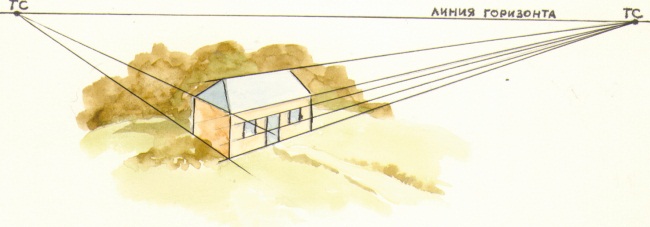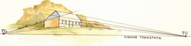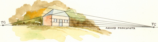 Упражнение. Давайте сделаем три небольших наброска: один домик будет находиться прямо на линии горизонта, другой выше неё, третий – ниже (рис. 9.3–9.5).