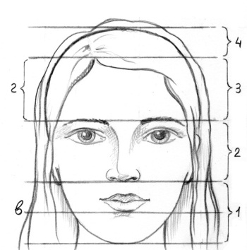 Если смотреть на голову спереди, то центр её будет расположен между глазами. Это основная опорная точка, которая позволяет художнику с самого начала работы проверить правильность рисунка (рис. 17.1, а). Если смотреть на голову спереди (границы черепа без волос), то центр головы будет расположен на переносице точно посередине, между глазами (рис. 17.1, б). После разделения головы на модули можно получить ещё одну опорную линию, если провести её посередине нижнего модуля. Новая линия будет приблизительно определять положение нижней губы (рис. 17.1, в).