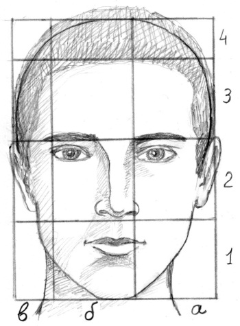 Как правило, высота головы человека приблизительно в три с половиной раза больше высоты лба (от границы роста волос до уровня бровей) (рис. 17.1, г). Таким образом, высота лба является основным эталоном, или измерением, определяющим пропорции основных частей лица. Следовательно, если мы разделим высоту головы с помощью горизонтальных линий на три с половиной части (рис. 17.2, 1–4), то сможем определить расположение и пропорции следующих элементов: верхний профиль головы или черепа без волос; границу роста волос; расположение бровей; высоту и расположение ушей, кончика носа и нижней части лица до края подбородка.