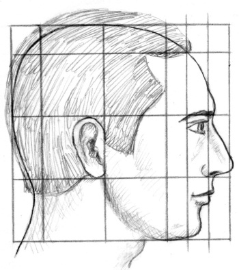 Изображение головы в профиль Голову в профиль можно вписать в квадрат размерами три с половиной модуля в ширину и три с половиной модуля в высоту (рис. 17.3, б). Деление изображения головы в профиль на модули помогает определить расположение уха, а также глаза и рта. Для этого необходимо разделить первый модуль на пять равных частей (рис. 17.3, а).