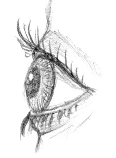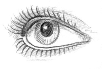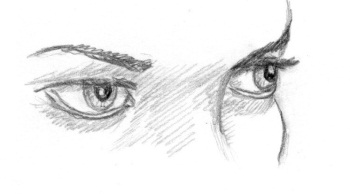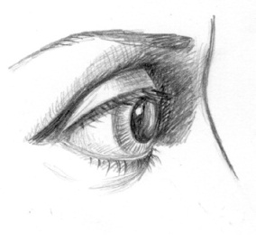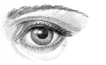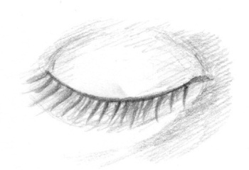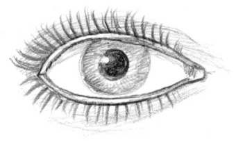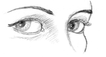 Если смотреть на человека в профиль, то сферическая форма глазного яблока будет почти незаметна, форма глаза будет в большей степени определяться выступающими вперёд веками, особенно верхним (рис. 17.6). Зрачок человека всегда чёрный, а его яркость делает человека живым. Радужная оболочка может иметь разный цвет, но он никогда не бывает однородным. В большинстве случаев внешняя часть радужной оболочки более тёмного цвета. Помните, что белки глаз всегда должны быть слегка заштрихованы (в направлении, противоположном направлению лучей света), чтобы подчеркнуть сферическую форму глаз (рис. 17.7).
