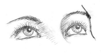 Изображение верхнего века точно так же, как нижнего – это одна из наиболее распространённых ошибок (рис. 17.5, а). На самом деле нижнее веко смещено дальше от глаза (рис. 17.5, б).