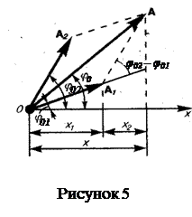 воспользовавшись методом вращающегося вектора амплитуды. Построим векторные диаграммы этих колебаний (рис 5). Так как векторы а1, а 2 вращаются с одинаковой угловой скоростью w0, то разность фаз между ними (j02 - j01) остается постоянной. Очевидно, что уравнение результирующего колебания будет